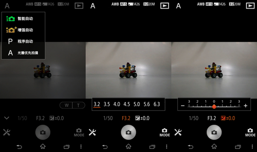在PlayMemories Mobile应用程序中右上角可以选择当前的拍摄模式,共有四种模式可以选择,特别值得一提的是索尼QX100具有A档(光圈优先)可以使用,也就是说我们可以随时调节光圈,这一点要绝对是领先目前智能手机的一点,因为索尼QX100的F1.8的大光圈随时都可以使用。同时在这个应用程序中我们还可以对曝光补偿进行调节。这每一点都体现了这款镜头机的之处。