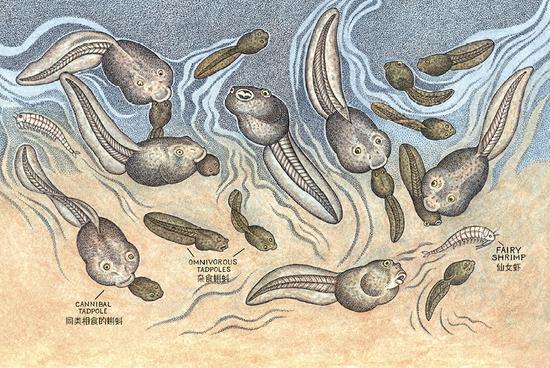 水池的不稳定性给蝌蚪生存带来威胁,在特殊的环境压力下,那些能够快速获取营养,以更快速度完成变态发育的蝌蚪才能更好地活下来。性命堪忧时,生命才不会考虑礼仪道德。部分大蝌蚪通过捕食同胞来获取高质量动物蛋白,顺便还一并吸收小蝌蚪体内未消化的植食。荤素搭配,一举两得。
