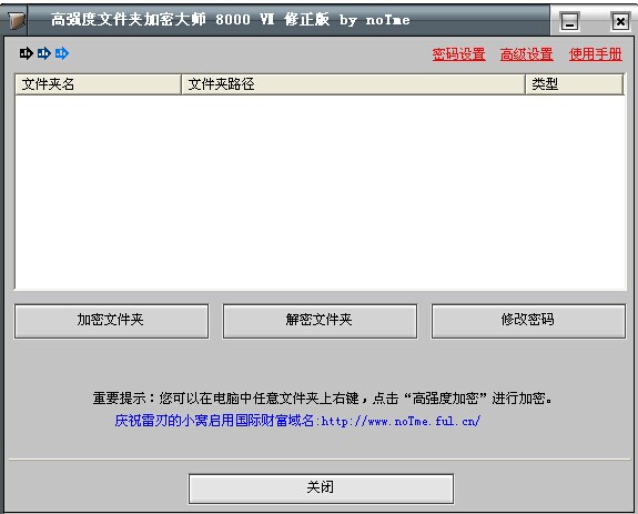 度文件夹加密大师(文件夹加密工具)是一款绿色好用的文件和文件夹加密软件。软件功能强大,具有界面漂亮友好、简单易用、稳定无错、功能强大和兼容性好等特点。并且它不受系统影响,即使重装、Ghost还原、系统盘格式化,也依然可以照样使用。经它加密的文件夹可以移动到其他电脑上使用。高强度文件夹加密大师 免费版