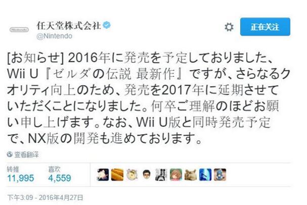 同时为了“进一步提升游戏品质”,原定于2016年推出的《塞尔达传说》新作也将延期至2017年推出,将同时登陆在Wii U和NX主机上。