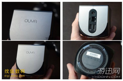 OUYA的接口都被放到了机身背部,种类相当丰富:全尺寸HDMI和USB、以太网、microUSB、还有一个电源插孔。这部分的设计显得有些拥挤,插上HDMI线之后想要再用别的接口就非常费劲了,不过OUYA至少提供了用户所需的几乎所有接口,它们的位置也让各种线缆不会太过显眼。OUYA的电源键位于机身顶部,上面有一个“U”字样的指示灯,机身正面则是OUYA的logo。