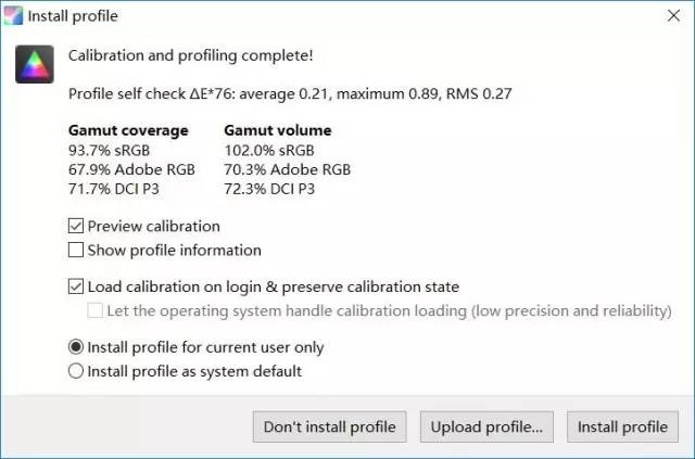 色域色准:使用爱色丽i1 Display Pro校色仪、DisplayCAL测试软件,对屏幕预热30分钟以上。实测色域93.7% sRGB、67.9% Adobe RGB,平均△E=0.21、最大△E=0.89,在非广色域屏幕中处于优秀水平。值得一提的是,手里这台XPS15(9560)在未校准情况下,R、G、B三通道的输出就几乎是对齐的,这对于没有校色仪的同学是一大利好。