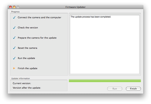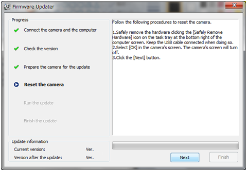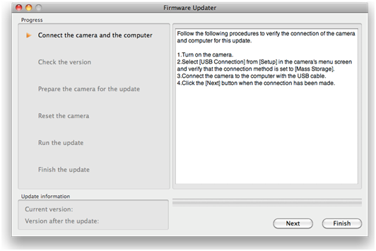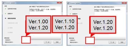 注意:如果固件版本已经是Ver.1.20,没有必要再进行升级,请按照提示终止USB连接,并点击Finish按钮,关闭照相机,拔除电源或者取出电池,然后重新开机。