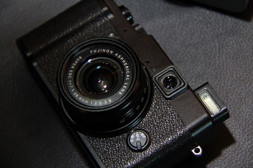 从外观上来看,富士X10和大哥X100除了在色彩方面有所不同外,整体造型非常近似。用跟一句通俗的话来说,富士X10就是一个“小一号的X100”。富士X10并没有采用X100的混合式取景器设计,因此机身正面没有取景器切换拨杆,不过它身体正面多了一个对焦模式拨盘,机顶则有一个弹出式的闪光灯。富士方面提醒我们注意它的这枚四倍光学变焦富士龙镜头的规格。这枚镜头在光圈段时光圈为F2,关键点是它在长焦端时光圈依然有F2.8。我之前曾经比较过富士X10和它的几位消费旗舰对手,到目前为止应该仅有奥林巴斯XZ-1的镜头规格优于X10,而佳能、松下等公司的竞品都在规格上稍弱一点。