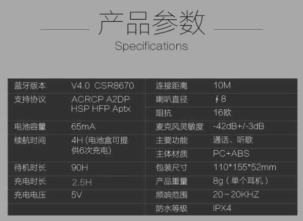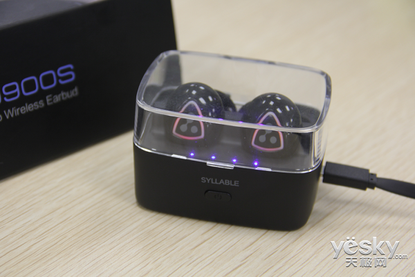 D900S抽屉盒式的包装采用黑色装潢,包装正面是戴着耳机的模特形象,背面是中英文双语对产品性能特点的简介。里面的配置相当贴心和精美。打开包装,可以看到两只D900S被放置在智能充电底座里面。