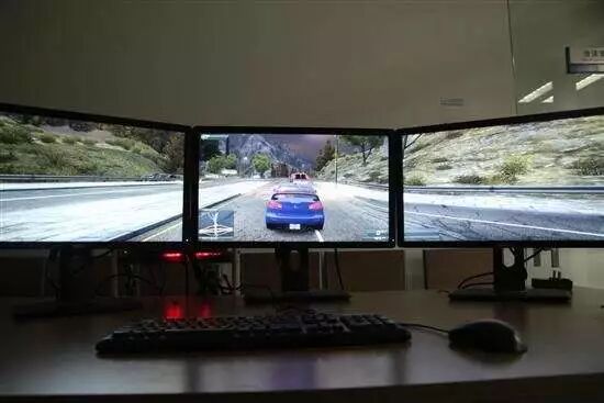 相比之下,虽然下图这种传统 3 屏 3D 游戏对硬件的要求更高,画质更好。但从游戏中获得的乐趣却远远不如 VR 带来的强烈。