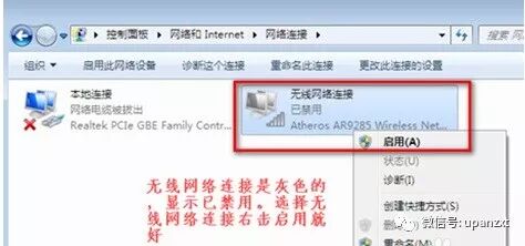 3. 在“网络连接”窗口中,如果网络连接中的无线网络显示为灰色,则我们将右键单击“启用”.