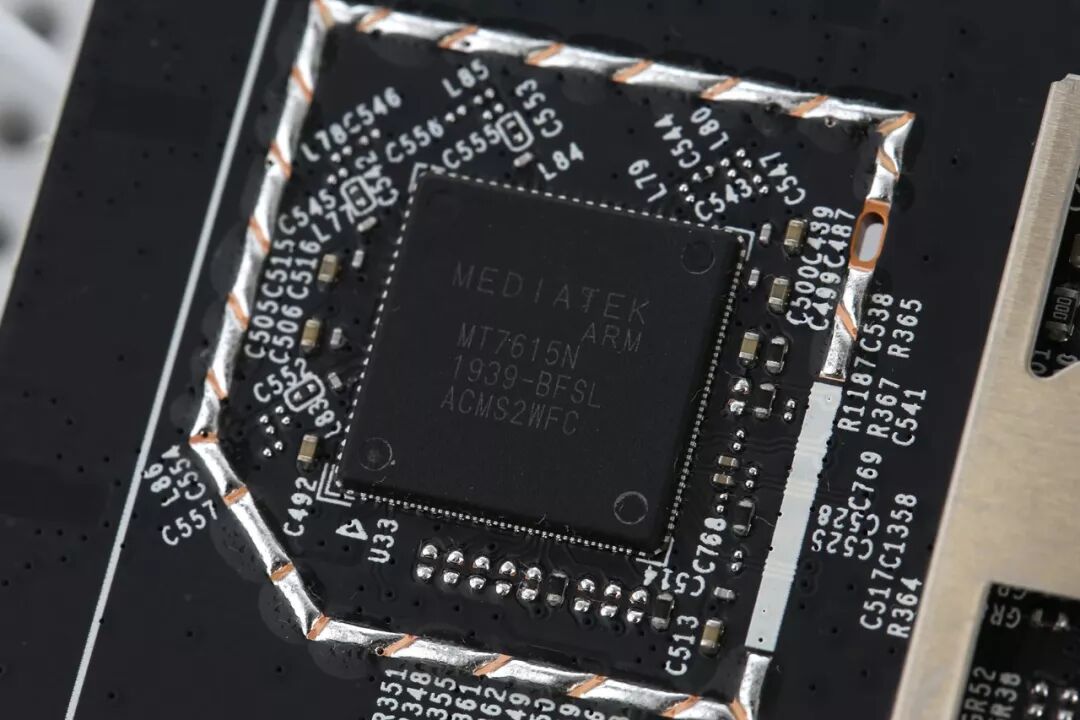 ▲负责2.4GHz频段的无线网络芯片型号MT7603E的最大理论传输速率为300Mbps.