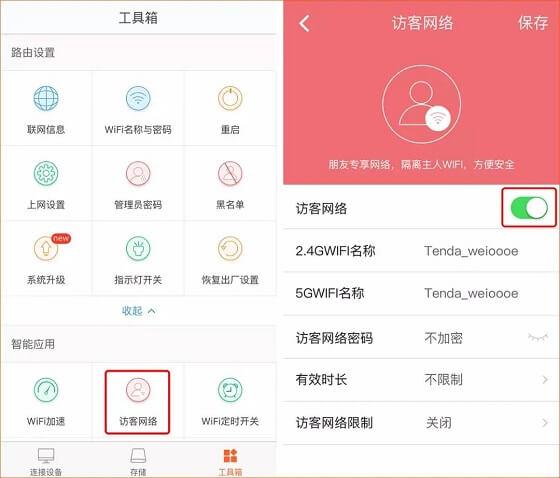 方法: 打开“ Tenda WiFi”管理应用程序,单击[工具箱]-[访客网络]-打开此功能并设置相关参数: 无线信号名称,无线密码,有效的互联网访问时间,最后单击[保存]. ].