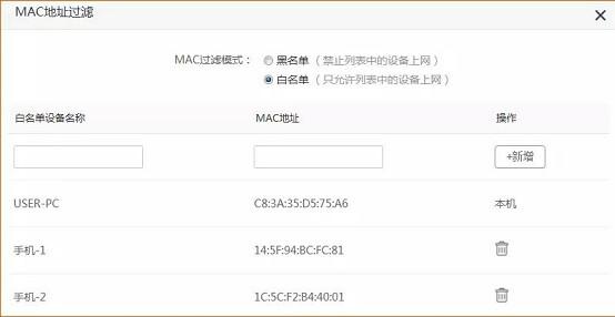 使用MAC地址过滤功能,可以添加MAC地址过滤规则. 设置完成后,除非它是用户已添加的设备,否则其他陌生的设备即使知道WiFi密码也无法连接到WiFi.