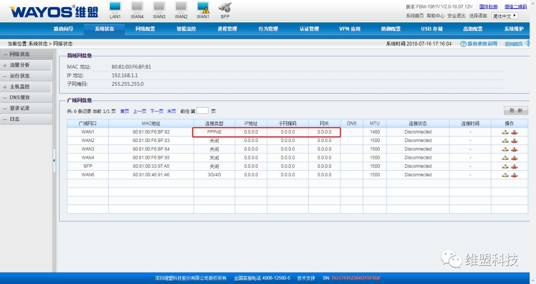 登录到路由器配置界面,然后转到系统状态→网络状态. PPPOE拨号错误将导致网络限制. 请检查宽带线路和帐户密码;
