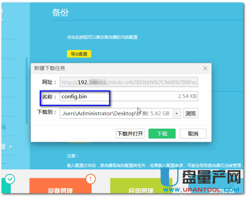 4. 选择要导出配置的文件夹,单击下载,配置为.bin文件,配置文件可以直接放在桌面上