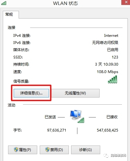6. 在“详细信息”中,我们可以看到“ ipv4”和“ ipv4默认网关”. 通常,“ ipv4默认网关”是我们路由器设置页面的IP地址.