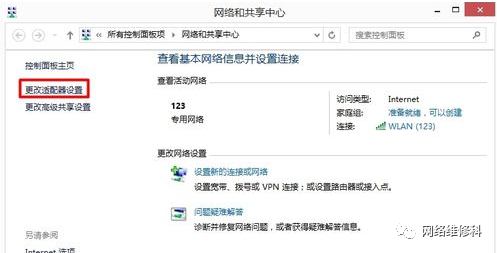 转到“网络和共享中心”,然后选择“更改适配器设置”