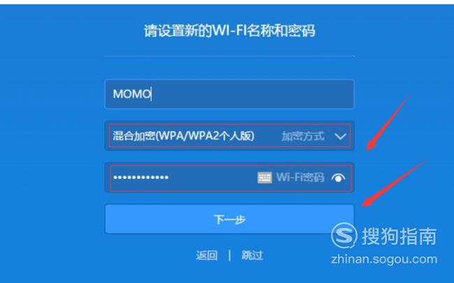 如果尚未设置家用的小米迷你路由器,则需要在无线接口上选择加密方法,然后输入无线密码. 输入无线密码后,单击“下一步”以完成无线密码设置.