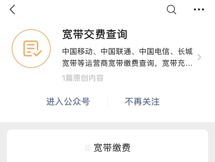 可以通过[宽带支付查询]微信官方帐户直接处理宽带服务. 输入正式帐户后,系统会自动将您推送到查询条目.