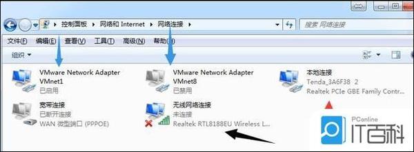 红色箭头表示有线网卡,本地连接