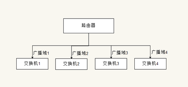 如上图所示,路由器将广播域分为四个部分,每个交换机都连接到一个小型LAN,这四个小型LAN使用它们自己的广播域进行广播. 此外,使用VLAN(虚拟网络)技术还可以起到分隔广播域的作用.
