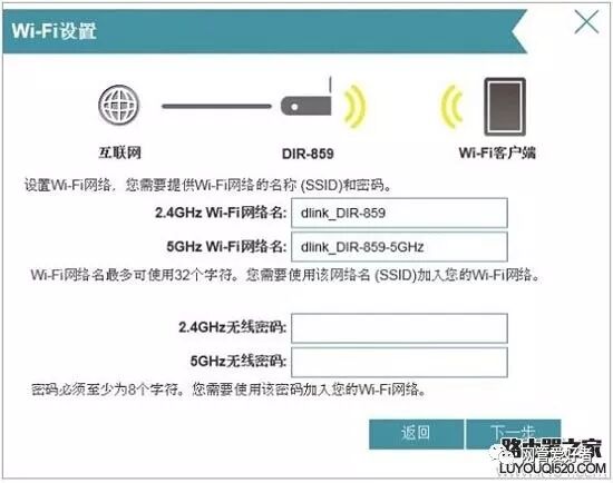 4. 在DIR-859无线路由器中设置/修改2.4G和5G无线网络,无线名称,无线密码->单击“下一步”.