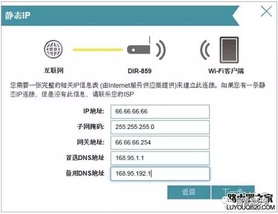 然后填写宽带运营商提供的静态IP地址,子网掩码,网关和DNS->单击“下一步”.