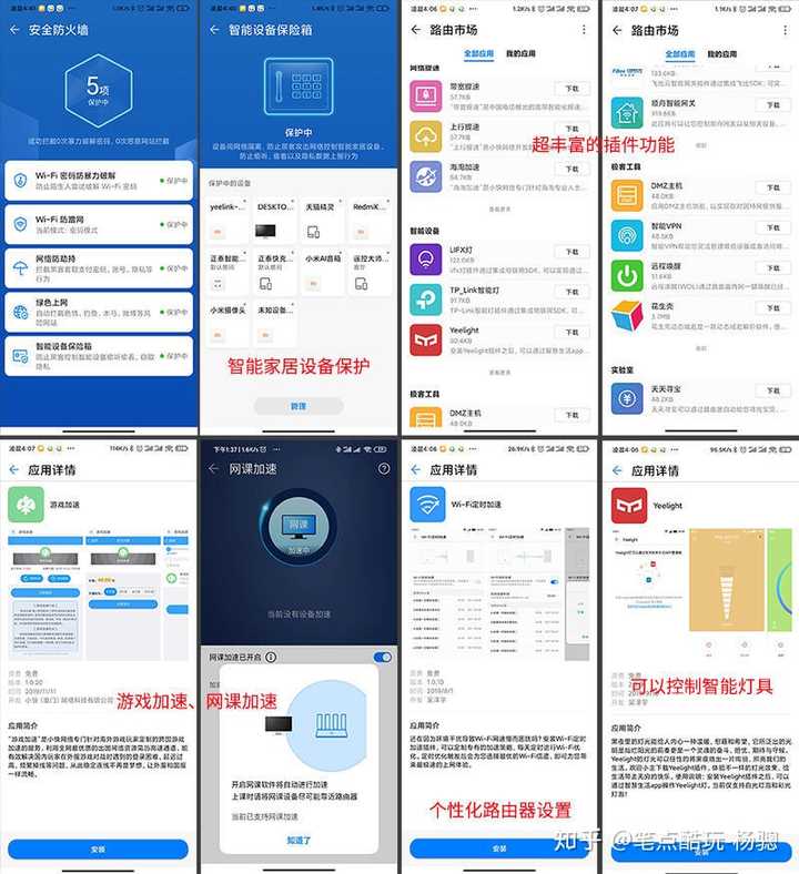 这些插件非常实用,例如游戏加速,课程加速等。它们非常适合国王,手机游戏派对,桌面游戏咖啡馆,也非常适合家庭互联网学生。父母想给孩子们照顾手机已设置为可定期进行互联网控制,并且AX3 Pro也可以满足严格的需求。让我感到舒适的是,还可以通过安装与APP相对应的Yeelight插件来控制家里的Yeelight智能灯。突然我想说个赞美词:“您控制得太多了,对吧。”