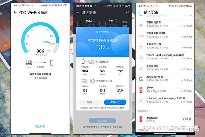 使用Redmi K30 Pro测量速度。 Huawei Smart Life APP带有自己的速度测量,可以分别显示从手机到路由器以及从路由器到宽带的网络速度(如下)。前者达到1014Mbps下载和3875Mbps,延迟为8毫秒,路由器到宽带为132Mbps下载,1 3. 8Mbps上载和21ms延迟。基本上,两个网络速度都已达到上限。通过该APP,可以查看所有连接设备的状态,并可以实时限制停电和速度,这很容易操作(右图)。