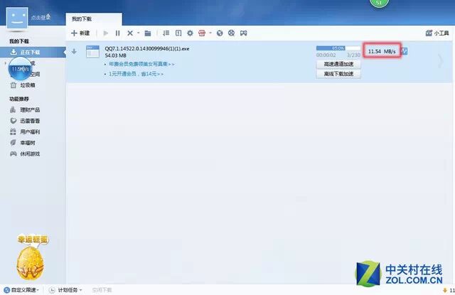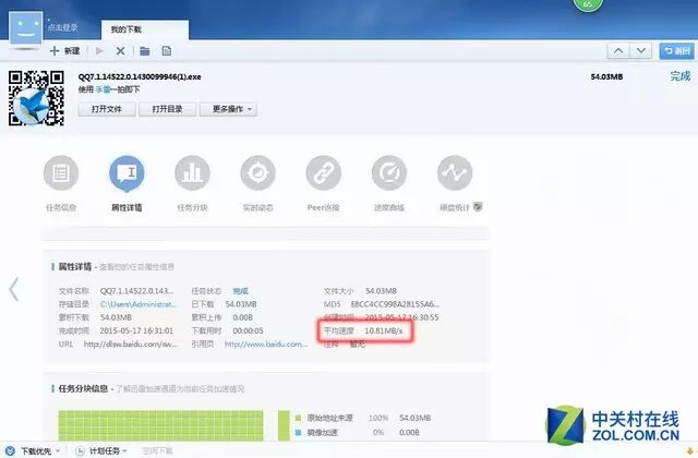 从实际测量中可以看出,部署电信100M宽带后,使用Thunder下载最新版本的QQ软件(5 4. 03MB),最高下行峰值可达到11MB / s,平均下载速度也为1 0.,达到81MB / s的出色结果。立即下载了超过50兆的QQ软件!