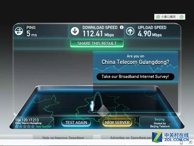 通过实际测试,我们可以看到电信100M光纤宽带的峰值很容易超过100Mbps。在测试期间,最大下行速率可以达到112Mbps(约14MB / s),上行速率达到4. 9Mbps(约612KB / s),PING(延迟)值仅为5ms。庸俗的。