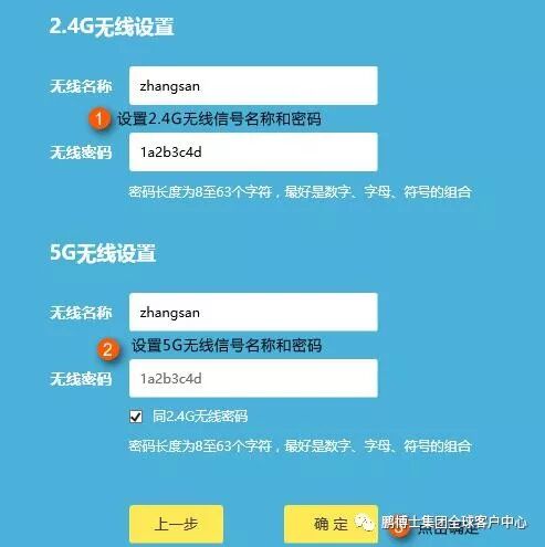 分别在2. 4G和5G无线网络中设置相应的无线名称和无线密码。建议“无线名称”使用数字或字母的组合,不要使用中文,“无线密码”建议设置8〜63位数字和字母的组合,单击“确定”。如下: