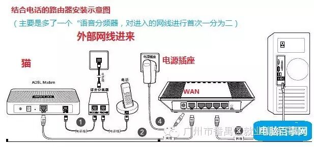 在许多公司或家庭中,除了上网冲浪之外,还需要将其分配给手机,那么如何实现呢?实际上,这非常简单。只需添加一个“语音转换”即可。该设备的主要功能是将电话线分为两个端口,猫和电话使用这两个端口,并且仅使用另外两个电话线。安装方法与上面基本相同,如下图所示: