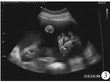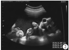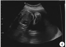 胎儿左眼距1.2 cm,右眼距1.2 cm,眼距1 cm(图2)。胎儿上唇中部唇腭回声缺失约0.9 cm(图3)。胎儿双肺显示不清,部分肝脏进入左侧胸腔,右移(图4)。胎儿右侧足底平面和小腿骨骼长轴切面可在同一切面内显示,右侧拇趾短与第2趾间距增大(图5)。超声诊断:①单胎,中孕,存活儿;②胎儿全前脑畸形;③胎儿全前脑面容(正中唇腭裂、眼距过近);④胎儿右足内翻合并拇趾短、草鞋脚;⑤胎儿左侧膈疝;⑥脐带胎盘入口处囊肿;⑦羊水过多。
