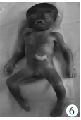 引产胎儿所见:全前脑面容(正中唇腭裂型)、脐带胎盘入口处囊肿、右耳低位并畸形、左耳缺如、右足内翻合并拇趾短、草鞋脚全前脑畸形。尸体解剖所见:部分肝脏及肠管进入左侧胸腔,右移,双肺受压。家属拒绝胎儿染色体检查,因此无法确定染色体异常。