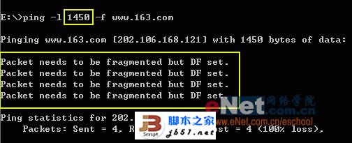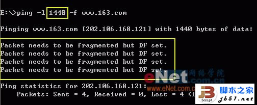 * –l 14xx参数:发送一个定长数据包,14xx是要测试的包大小,如前所述,ADSL的MTU一般在1450与1492之间,第3步中将每次更换一次该值