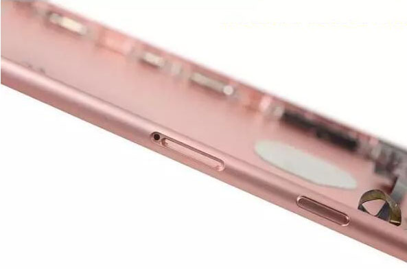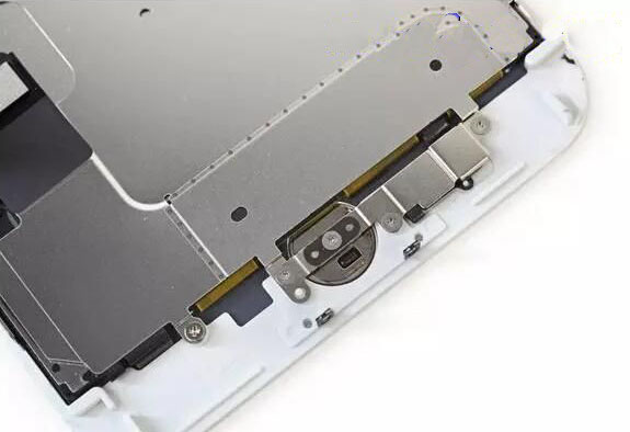 在当时耳机插口存在的地方,我们看到了一个新的零件,它看起来可以从里面将声音引入手机当中,然后再转移至麦克机。这个元件并不是很高档,只不过是设计出色的音响系统和金属模型。手机顶部有一个 Taptic Engine 零件,该部件通过振动反馈来模拟 Home 键的反弹,达到使用物理 Home 键的效果。
