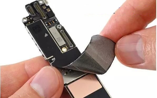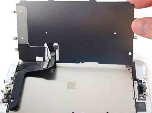 相比于之前的旧型号,iPhone 7 Plus 的主板更容易取出,因为我们不需要把主板翻过来就可以终止最终的连接装置了。这也是一个非常微妙的差异,但通常小变动都会对设施的可维修性带来很大制约。把电磁干扰(EMI)贴纸撕开以后,我们发现了也许是附加的热管理材质,A10 处理器应该就在上面了。