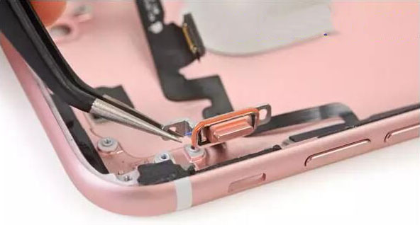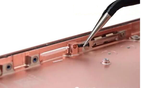 现在我们要拆下静音开关和电池键,以及剩下的按钮排线。音量键和电池键与壳体紧贴,所以特色的拆解方法在这里并不适用。苹果这样做拆手机教程,也是为了更好地防水。