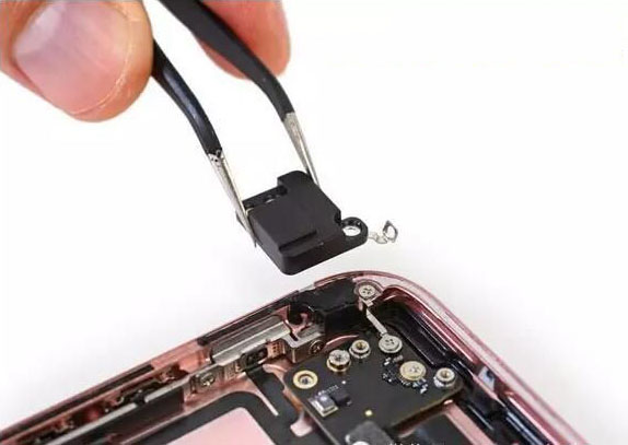 将扩音器取下之后,我们发现了一些时尚的弹性联结装置或者一些保护入口的网状物。与 iPhone 6s Plus 以及 iPhone 6 Plus 的扬声器设计类似,iPhone 7 Plus 也有天线附件。