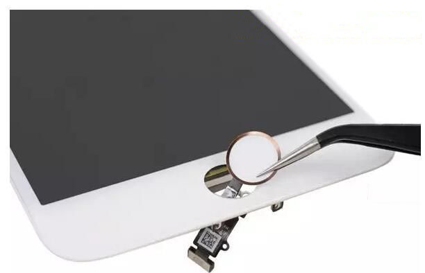 现在要拆下整个显示屏组件的最后一个零件:Home 键。更准确地说,它是一个触摸传感器,而不是“键”。正如你们所见到的,这个固态 Home 键是可以拆下的,不过其拆卸过程并不简单,因为你要处理掉几颗“三点式”螺丝,还有排线下面的粘合剂。