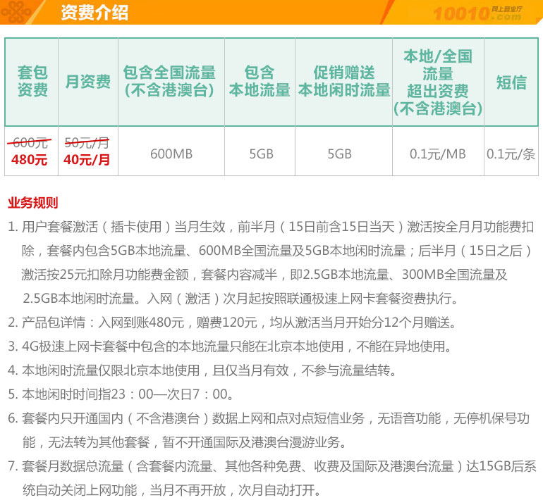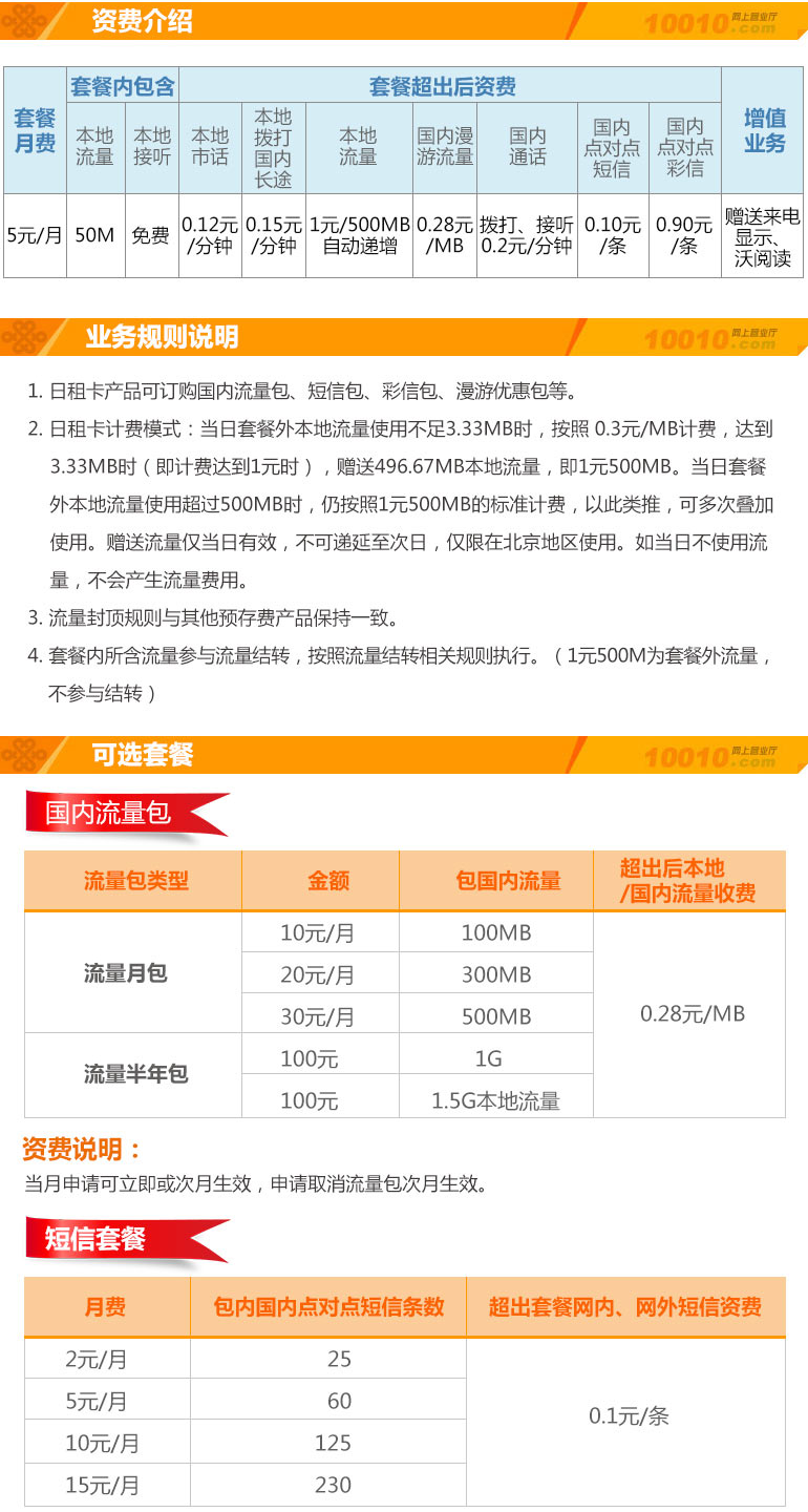 5.北京联通 5元卡/日租卡:月租5元,含50MB本地流量,全国接听免费,全国拨打0.15元;其中日租卡每日1元本地500MB。