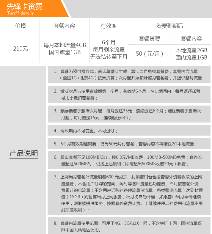 这个套餐感觉就是跟移动极速卡PK的,不过是半年卡(激活当月免费用,流量按天折算,所以最多可以用7个月),网上营业厅卖210元,正是极速卡优惠价的一半。每月本地4GB、全国1GB,相比联通本地少一些、漫游多一点,差不多也够了。折合每GB 7元,但不如人悦卡一年有效那样灵活。更合适对漫游流量有意愿的人。不过不建议续费,不但应按50元/月的资费续,本地流量还降低2GB(按官方说法之前是赠送的)。京东目前卖179元。
