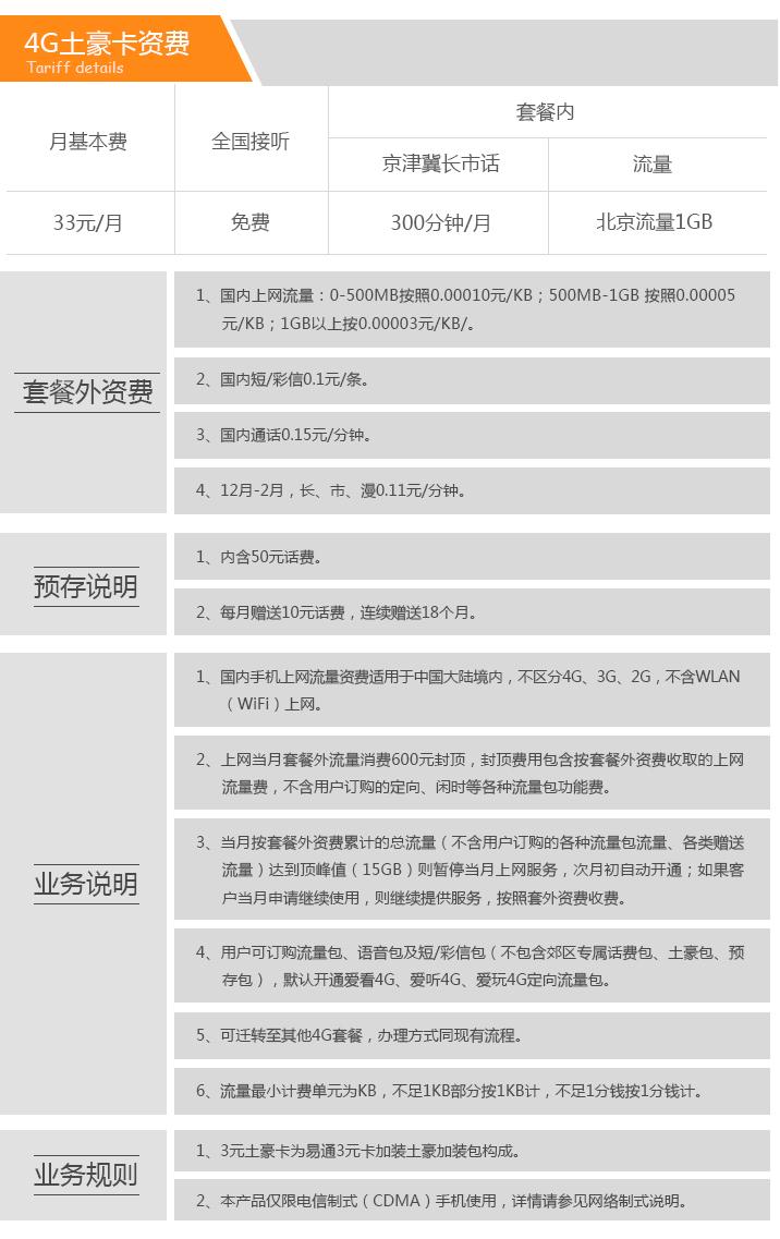 4G土豪卡源自3G时代的“3元土豪卡”,其实是3元易通卡+30元土豪包,实际月费33元(头18个月每月返10元赠费,实际消费23元),现在更新至4G了,资费不变。套餐内容为每周1GB北京流量,300分钟京津冀主叫,全国免费接听,但没有iFree卡的京津冀本网免费拨打的特权,且流量仅结转一个月,通话时长仅当月有效。