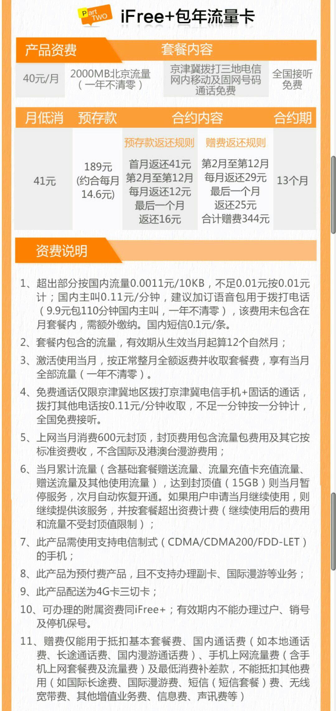 3. 北京电信 iFree+包年流量卡(可通话):官网189元,13个月免充值。每月2GB本地流量,可延期,12个月不清零;