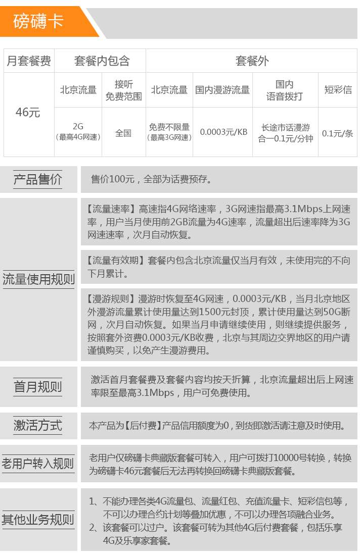 1. 北京电信 磅礴卡:月租46元,2GB本地高速流量,超出后时速3.1Mbps无限使用;
