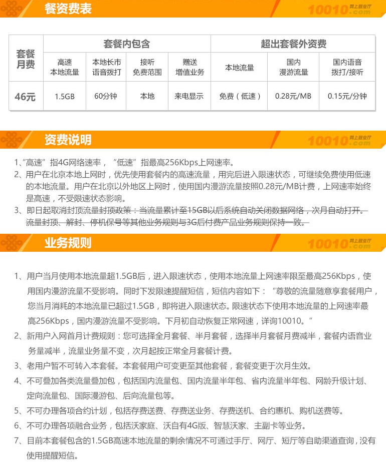 2. 北京联通 随意享:月租46元,国内拨打60分钟+2GB本地高速流量,超出后时速1Mbps无限使用;