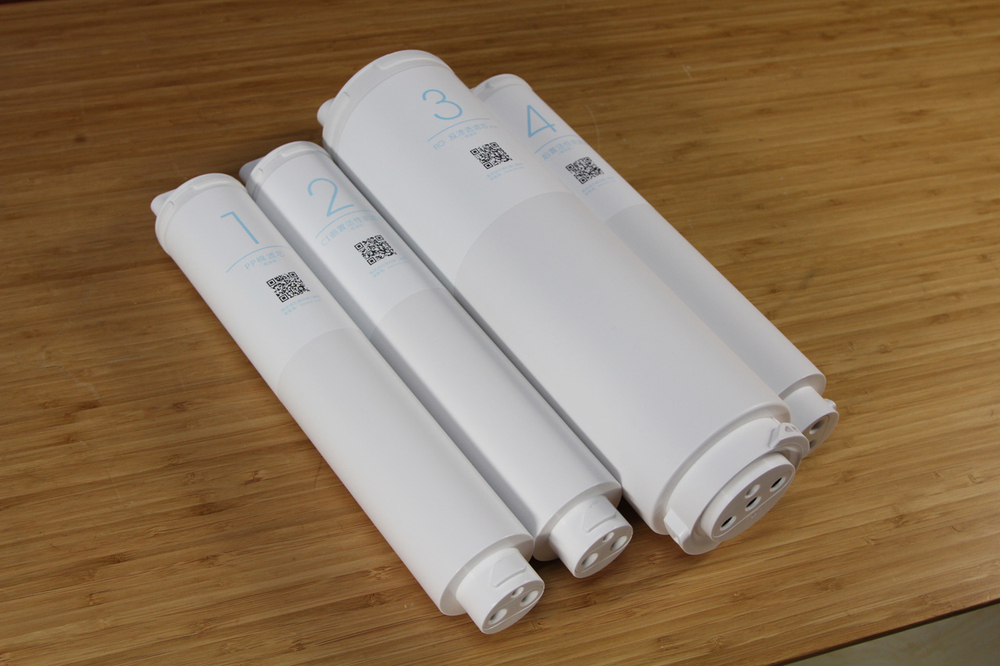 小米净水器的滤芯在前,开,关手柄上仍标有数字和类型. 这款厨房式净水器使用增强型滤芯,具有更高的净化效率. 另外,增强条过滤器元素添加了防伪LOGO,以减少用户购买假冒过滤器元素的风险.