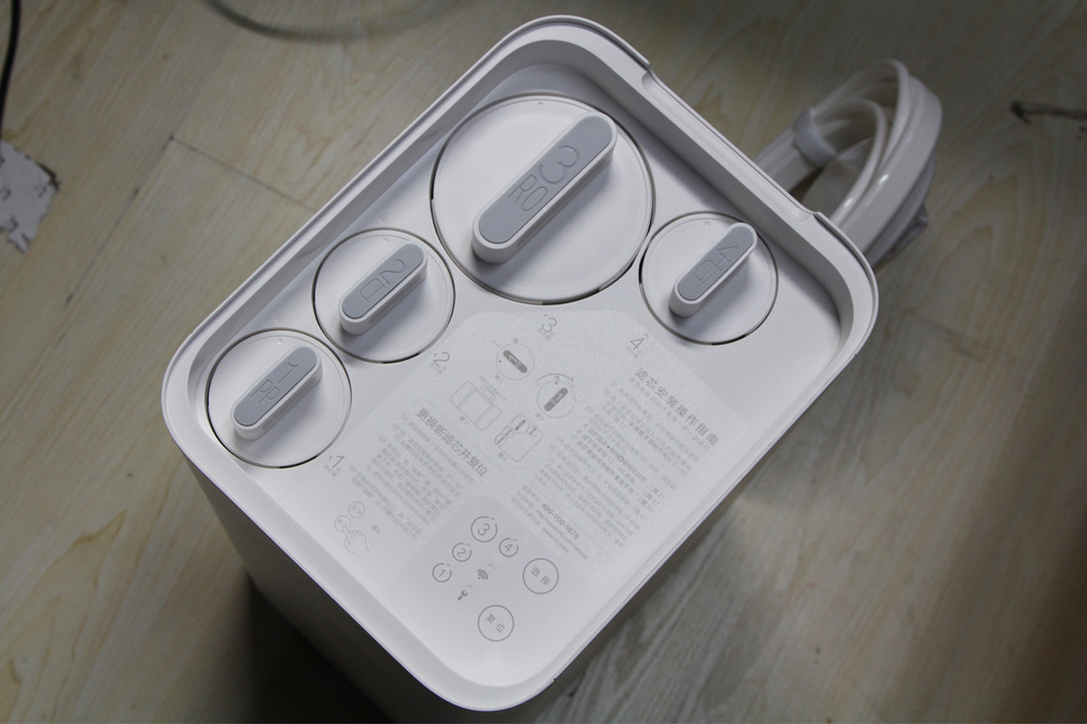 打开净水器的盖子. 除了MI标志外,顶部还有400克. 这里所说的400G是指每天处理400加仑的RO膜水,可以将其每分钟转换为1L纯水.