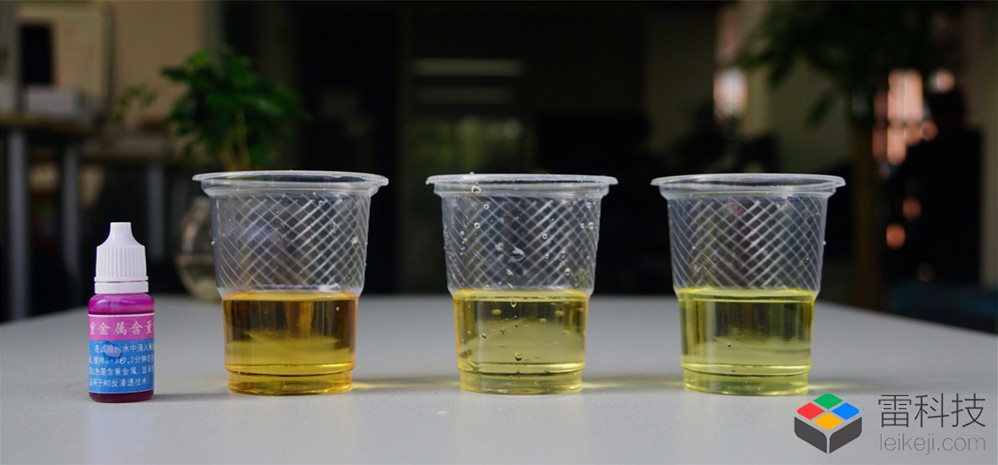 滴入一定量的重金属试剂后,摇动并静置2分钟. 如果水是红色,则其中包含重金属,而则表示没有重金属. 以下三杯水均为,但自来水为红色,说明该水中含有一定量的重金属,经小米净水器滤除后,颜色明显变黄,即颜色与桶装水相同,并且通过了重金属过滤效果测试.