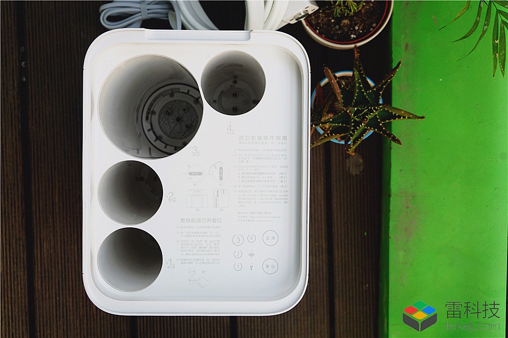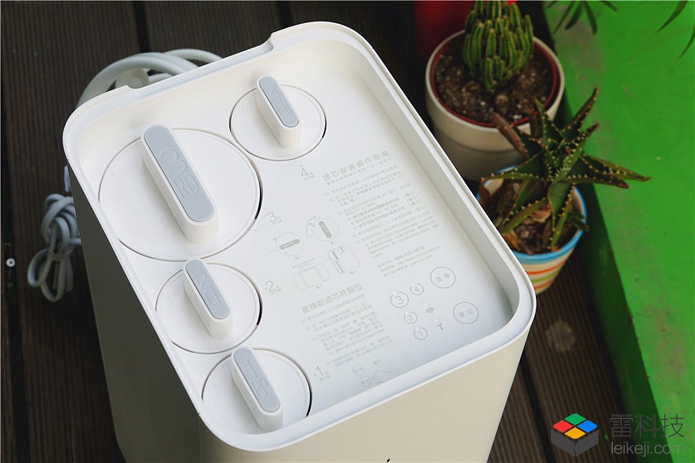 顶部防尘罩直接盖上,没有任何扣环设计,因此可以直接打开. 打开后,您会看到四个滤筒插槽,以及更换说明和更换过滤器操作按钮.