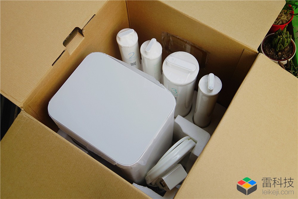 包装中包含: 小米净水器的主体,4个滤芯,水龙头安装配件盒和说明手册. 四个滤芯都用真空塑料包装,以防止运输和库存污染.