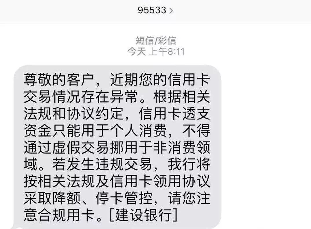 首先让我们看看持卡朋友收到的最警告短信的内容: 您最近的交易异常. 透支资金只能用于个人消费建行 短信,不能通过虚假交易挪用,这与相关的法规和协议非常相关. 在非消费者字段中. 发生违法交易时,我行将根据有关规定和使用协议,实行降额和卡挂牌控制. 请注意遵守规定使用卡.